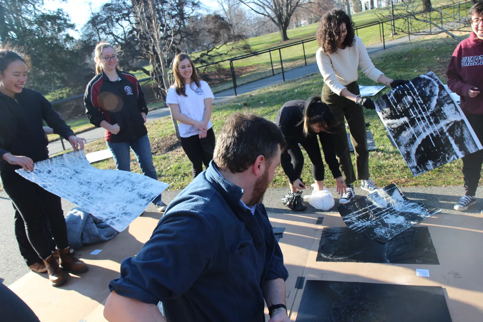 Painting students work on a project outdoors.
