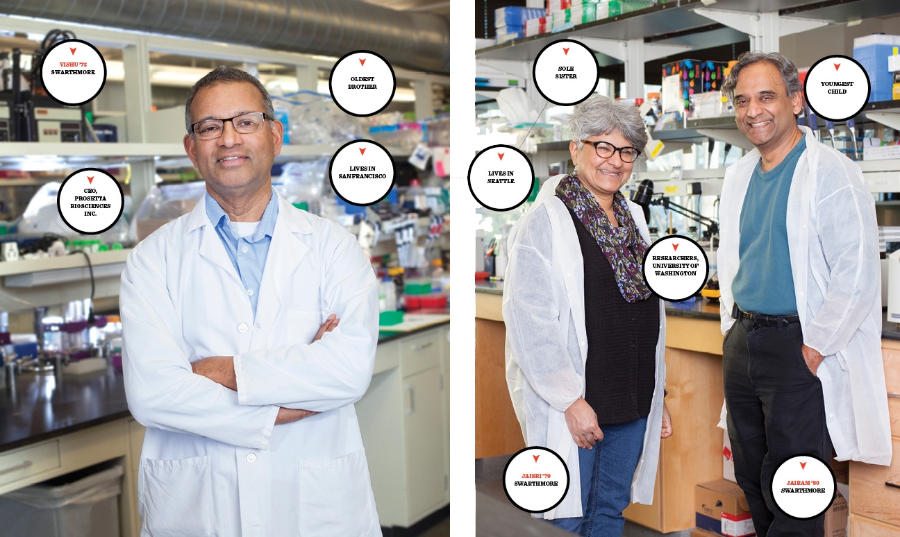 The Science of SiblingsScientific siblings stick together to target lethal virusesBy Dana Mackenzie ’79 When you meet Vishwanath “Vishu” Lingappa ’75, one of the first things you notice is his voice. In a blog for National Geographic, Carl Zimmer calls it a “radio-talk-show-host” voice. Other descriptions could equally well apply. It is a CEO’s voice and an orator’s voice. A simple interview with Lingappa has more dramatic pianissimos and booming crescendos than a Beethoven symphony. Most of all, though, it is a big brother’s voice, loud and encouraging and demanding at the same time. “I have a favorite story about Vishu,” says his brother, Jairam ’80. “As kids, when we were watching TV and got to a commercial break, he would say ‘Jai! I’ll bet you can’t make me a peanut-butter-and-jelly sandwich and milk and bring it back upstairs in less than a minute!’ ” As the youngest sibling, Jai always looked up to his big brother. He would race downstairs to make the sandwich. He didn’t realize that as soon as he left the room, Vishu would stop counting and then start again when he heard Jairam approaching. “Sixty-one! Sixty-two!” Vishu would say as Jairam burst into the room. “You almost made it! Next time you’ll do it!” In a literal way, Vishu has always been there for Jairam and his sister Jaisri ’79. When Jaisri and Jairam were undergraduates at Swarthmore, he arranged for them to work in his Ph.D. mentor’s laboratory at Rockefeller University during the summer. When Jairam decided to go to medical school after getting a doctorate in biophysics, he chose the University of California–San Francisco (UCSF), where Vishu was an attending physician, and Jaisri was a resident. The three Lingappa siblings lived in the same house, and their weekly discussions of cases from the New England Journal of Medicine were the stuff of local legend. In the competitive and individualistic world of academia, it is a rare thing for three siblings to stick together the way that the Lingappas have. Not only have they stayed close physically (Jairam and Jaisri now live in Seattle and teach at the University of Washington), they work in similar fields: Vishu and Jaisri focus on understanding how a host cell’s proteins get co-opted by viruses after infection, while Jairam uses human genetics to understand how viruses might enter the host in the first place. All have been involved with Vishu’s company, Prosetta Biosciences, either as founders or scientific advisers. Now 12 years old, the company is closing in on a new class of drugs that would be effective against multiple viral diseases. “If we are right that we have found the next generation of drug targets, it will change the face of the pharmaceutical industry,” Vishu says. He’s using his full-on CEO voice now—the one he used this winter to clinch the latest round of capital funding for his company. Viruses, beware! In the power of three Lingappas, you have found a worthy adversary. From Geneva to Sri Lanka … to Swarthmore Vishu was born in 1954 to parents who had a remarkable story of their own. B.T. and Yamuna Lingappa had met in India, after she wrote and published a story about two star-crossed lovers searching for knowledge. B.T., a great believer in the power of education, admired the story and became her pen pal. Before long, Yamuna was traveling hundreds of miles to meet him, and eventually they married. In the India of the late 1940s, it was absolutely unheard-of—a marriage for love, between people from two different Brahmin subcastes. “There was a big hullaballoo in the extended families,” Jairam says. The Lingappas moved to the United States to pursue doctoral degrees. After graduate school at Purdue (where Vishu was born) and postdoc positions at the University of Michigan and Michigan State (where Jaisri and Jairam were born, respectively), they settled down in Worcester, Mass., to teach and do research at Holy Cross College. But their days of wandering were not quite over. In 1969 and 1970, their sabbatical year, B.T. and Yamuna spent 13 months traveling the globe with Vishu, Jaisri, and Jairam. It was a formative experience for the younger Lingappas. The first stop was Geneva, for five months. “My parents, in their brilliant and maverick way, decided not to send us to an international school but to place us in a French-speaking local school,” Jaisri says—even though she and Jairam spoke not a word of French. “We had to learn very quickly.” The next stop was Turkey—and another eye-opening lesson outside the classroom. “Right next door to the hotel was a Turkish sweet shop,” Jairam says. “The owner lavished us with sweets, until the very last night, when he found out we were Americans, and he abruptly wouldn’t let us back into the store. It taught us how much politics impacts our lives, how the U.S. is regarded both positively and negatively abroad.” India came next. “We wandered all over the subcontinent, from Kashmir to Sri Lanka,” Vishu says. For the first time, the Lingappa children were confronted with the enormous economic disparity between their homeland and the homeland of their relatives. “I remember taking a rickshaw one time,” Jaisri says. “Back then, it was the equivalent of a taxi. But it showed you how human life was devalued, with people treated as almost beasts of burden. The person pulling our rickshaw did not look well. Mother asked him some questions and found out that he had a fever, and she helped him get medical care.” “It just didn’t seem right,” she says. “We had so many experiences like that, where it was clear that a small intervention could make a big difference. How powerless we felt … That experience made all three of us activists.” Of course, the ’60s were a time of social upheaval in America. In 1967, Vishu’s parents appointed him the family’s representative to the historic march on the Pentagon to 