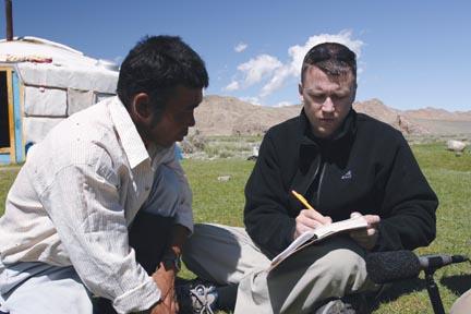 David Harrison (right) interviews Tserenedmit, a speaker of the Monchak language, in Western Mongolia. A new film—which premiered at this year’s Sundance Film Festival—shows Harrison and fellow linguist Gregory Anderson as they seek to identify and rescue endangered languages around the world.
