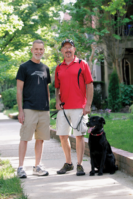 “Given that so many of our friends and acquaintances died of AIDS in the period between 1975 and now, Al and I both feel we were very fortunate to not just be together, but to be here and be alive,” says Steve Melov ’71 (left), with husband Al Goddard and Jagger, their lab rescue. Photo by Jay Paul