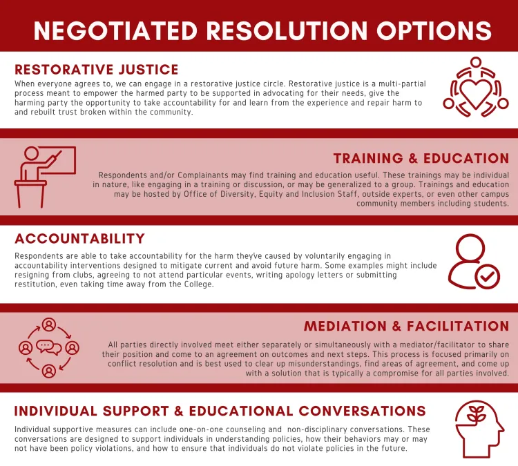 Negotiated Resolutions are processes guided and supported by the College that are meant to either (a) offer an pathway for resolving allegations of Discrimination, Harassment or Retaliation (when appropriate) and/or (b) address issues of culture or climate related to identity, inclusion and belonging.