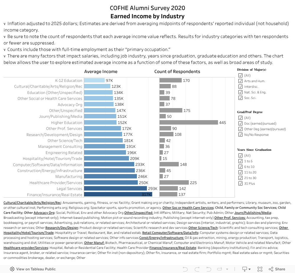 Though the College collects information about our alumni from a range of sources for our Alumni Records database, we also routinely ask about current activities on our COFHE Alumni Survey (managed by the IR office). The most recent survey was conducted in 2020. We have included an interactive visualization on alumni satisfaction [click here]. We also prepared a summary of the employment and education outcomes. The summary is available here; below is an overview.