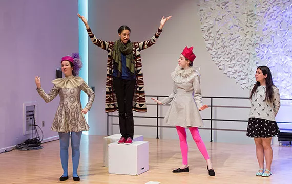 Here, four of the show's eight singers - Aurora Martinez del Rio '16, Kimaya Diggs '15, Kyle Leigh Carney '16, and Kelley Langhans '16 - rehearse.