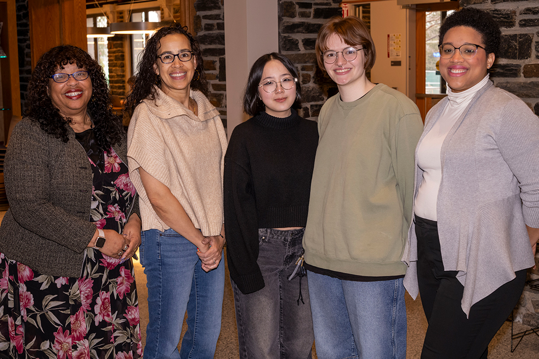 (Left to right) Associate Dean & Director of Case Management in Student Affairs Michelle D. Ray, Senior Lecturer in Dance Chandra Moss-Thorne, Emma Shi ’28, Annie Hauze ’27, and former Inclusive Excellence Fellows Initiative Program Manager Carol Pérez Quezada have been working to bring artist Denise Bright Dove Ashton-Dunkley to campus for over a year.