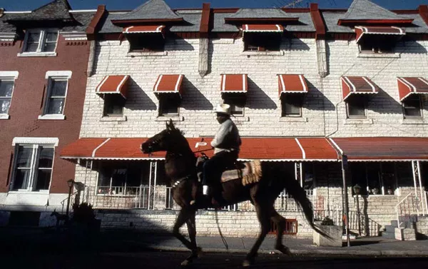 Bob Hill rides his horse down a street of rowhomes in North Philadelphia.